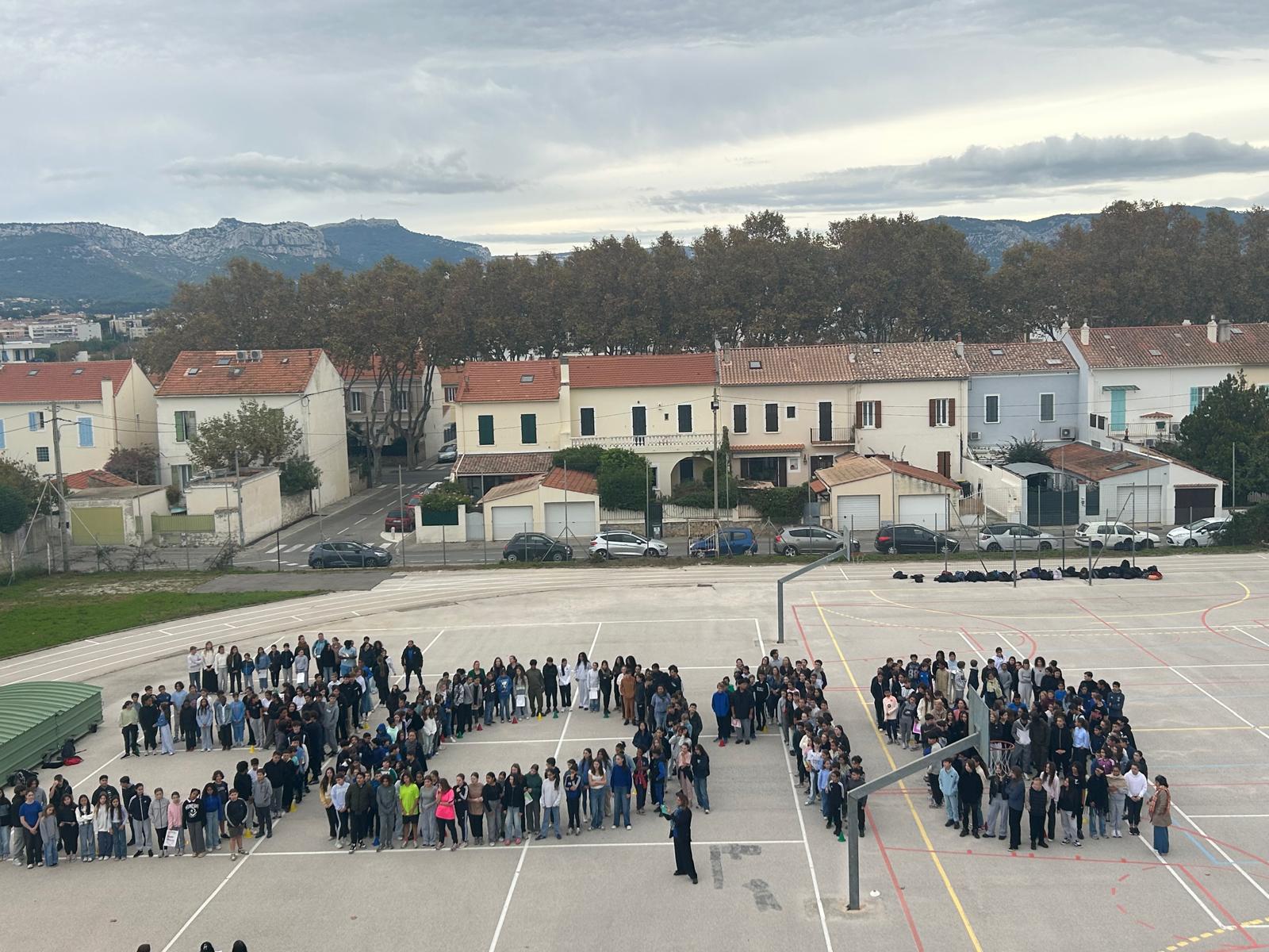 Le 6 novembre 300 élèves, professeurs, AED et personnels étaient réunis sur le stade pour marquer la journée nationale de lutte contre le harcèlement scolaire.
